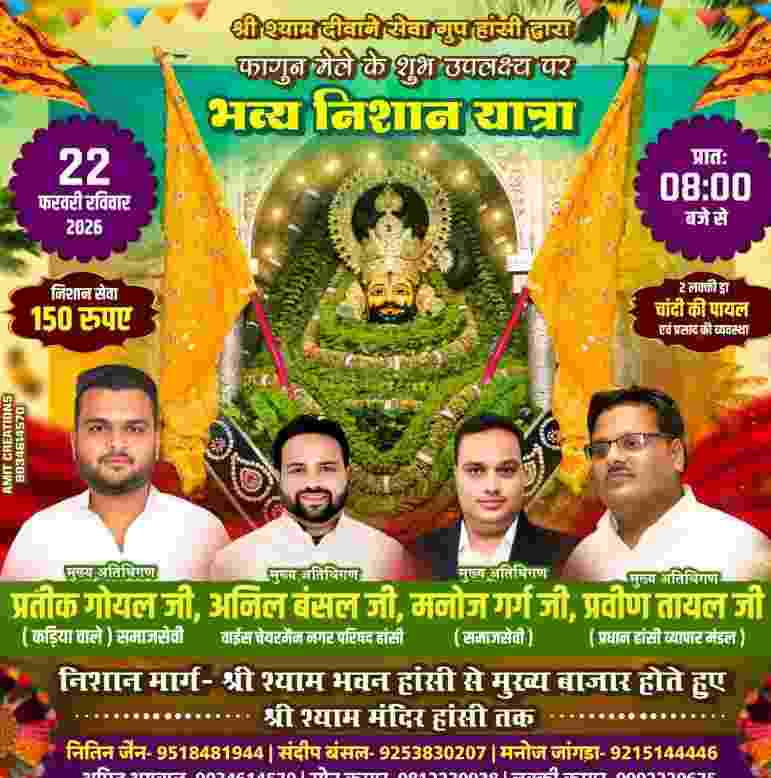 हरियाणा: फाल्गुन मेले के अवसर पर श्री श्याम की भव्य निशान यात्रा 22 फरवरी को होगी शुरू