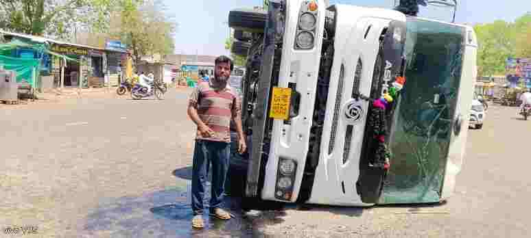 मध्य प्रदेश: मूंदी बस स्टैंड पर बलकर पलटा, फाउंटेन वाल क्षतिग्रस्त, बड़ा हादसा टला