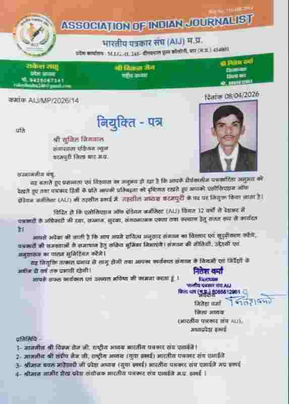 मध्य प्रदेश: सुनील निंगवाल बने AIJ धरमपुरी तहसील अध्यक्ष, पत्रकारिता जगत में दिखी खुशी की लहर