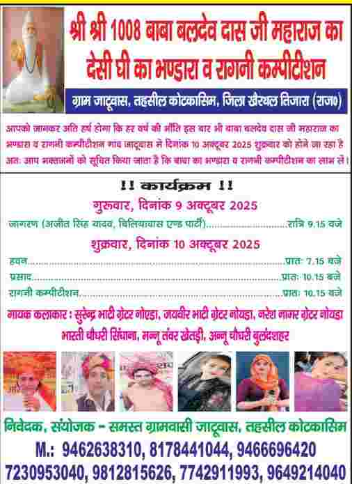 राजस्थान: बाबा बलदेव दास जी के सानिध्य में 10 अक्टूबर को देशी घी के भंडारे का आयोजन